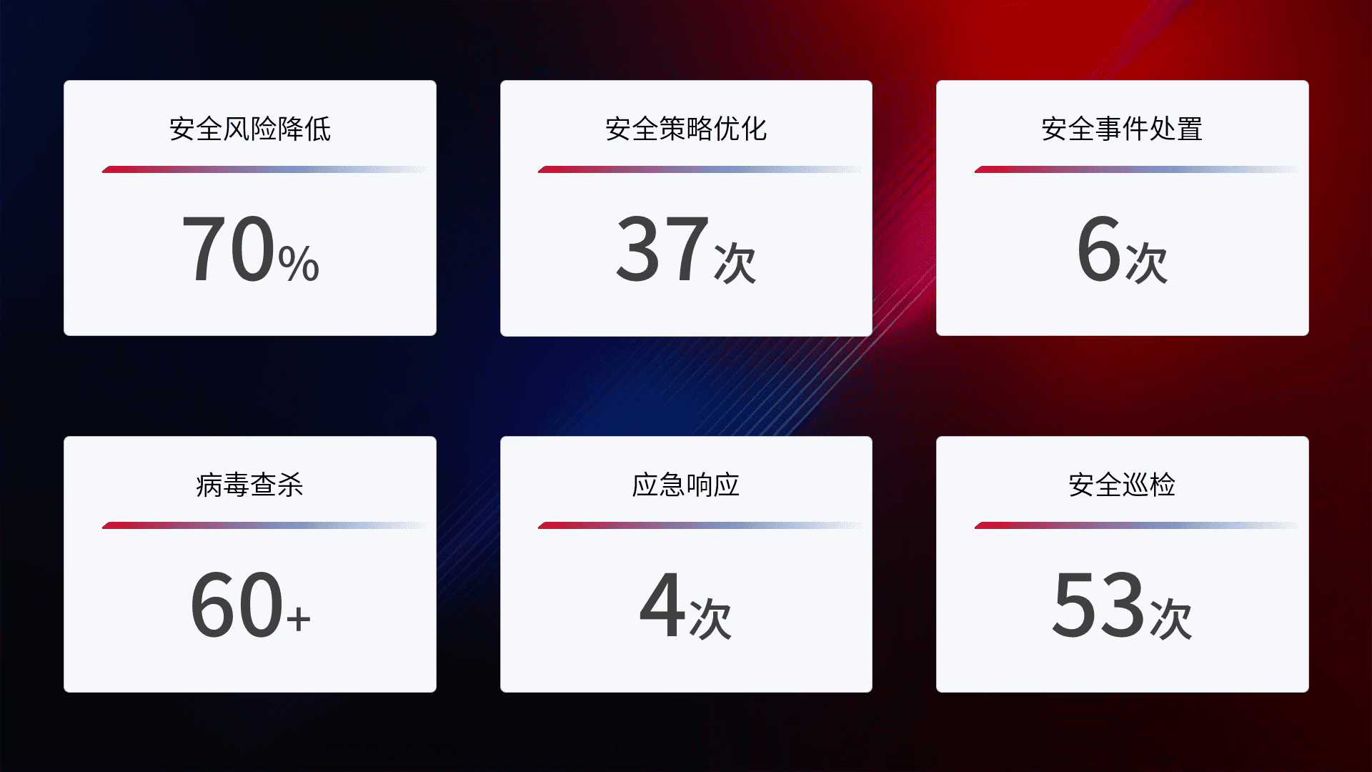 提供全面的安全事件报告体系,,,,包括处置报告、、、、周报、、、季度和年度总结,,结合持续监控,,,帮助客户深入了解网络安全状况。。